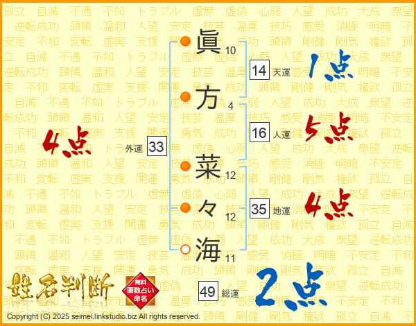 眞(10画)方(4画) 菜(12画)々(12画)海(11画)