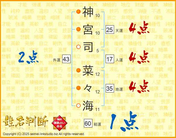 神(10画)宮(10画)司(5画) 菜(12画)々(12画)海(11画)
