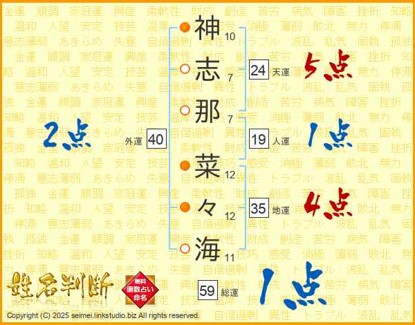神(10画)志(7画)那(7画) 菜(12画)々(12画)海(11画)