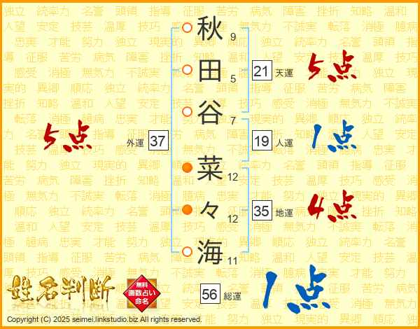 秋(9画)田(5画)谷(7画) 菜(12画)々(12画)海(11画)