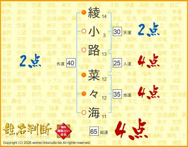 綾(14画)小(3画)路(13画) 菜(12画)々(12画)海(11画)