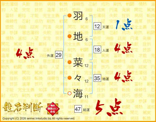 羽(6画)地(6画) 菜(12画)々(12画)海(11画)