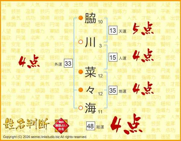 脇(10画)川(3画) 菜(12画)々(12画)海(11画)