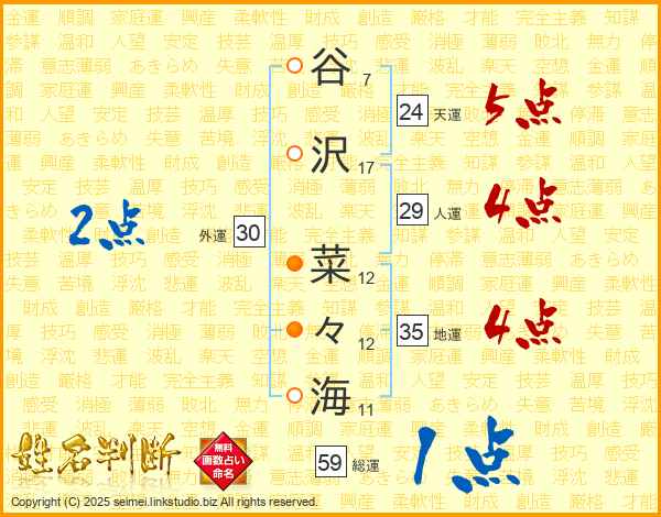 谷(7画)沢(17画) 菜(12画)々(12画)海(11画)