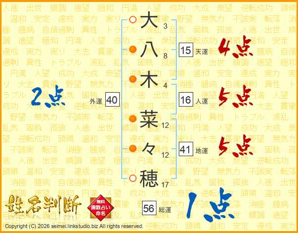 大(3画)八(8画)木(4画) 菜(12画)々(12画)穂(17画)