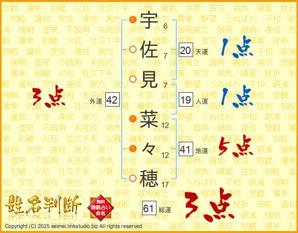 宇(6画)佐(7画)見(7画) 菜(12画)々(12画)穂(17画)