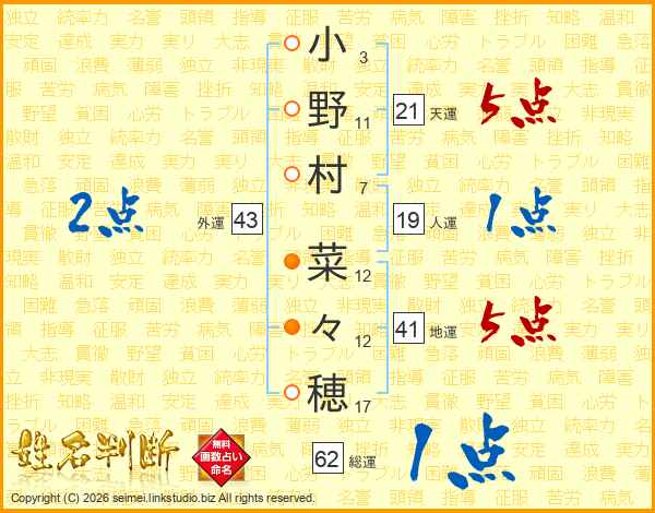 小野村菜々穂さんの地運は41画の5点!