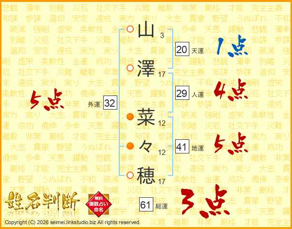 山(3画)澤(17画) 菜(12画)々(12画)穂(17画)