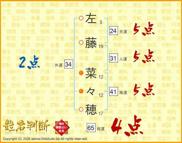 左(5画)藤(19画) 菜(12画)々(12画)穂(17画)