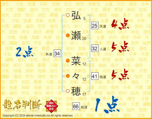 弘(5画)瀬(20画) 菜(12画)々(12画)穂(17画)