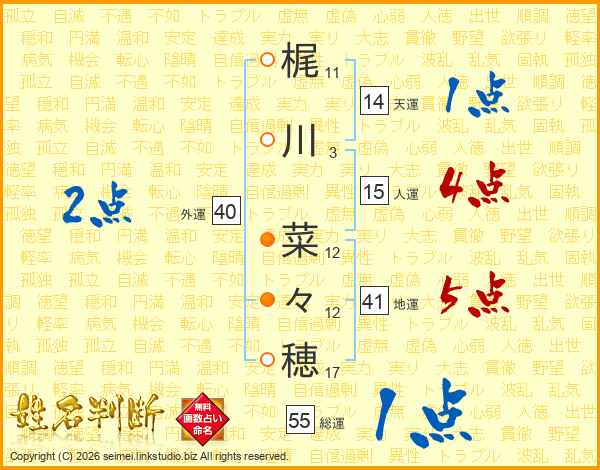 梶(11画)川(3画) 菜(12画)々(12画)穂(17画)