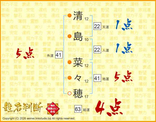 清(12画)島(10画) 菜(12画)々(12画)穂(17画)