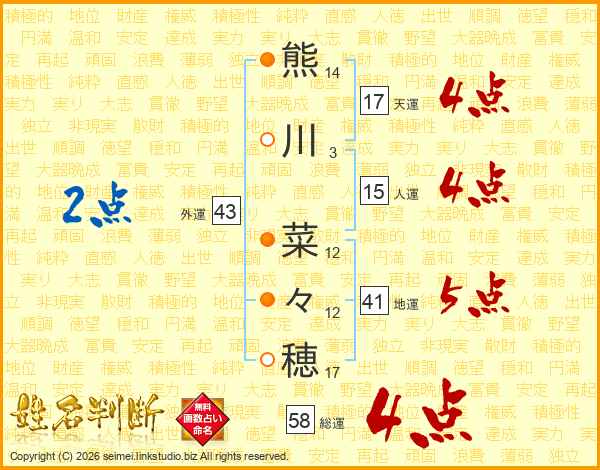 熊(14画)川(3画) 菜(12画)々(12画)穂(17画)