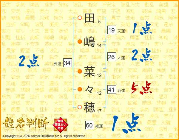 田(5画)嶋(14画) 菜(12画)々(12画)穂(17画)
