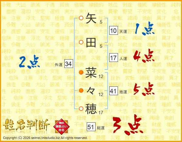 矢(5画)田(5画) 菜(12画)々(12画)穂(17画)