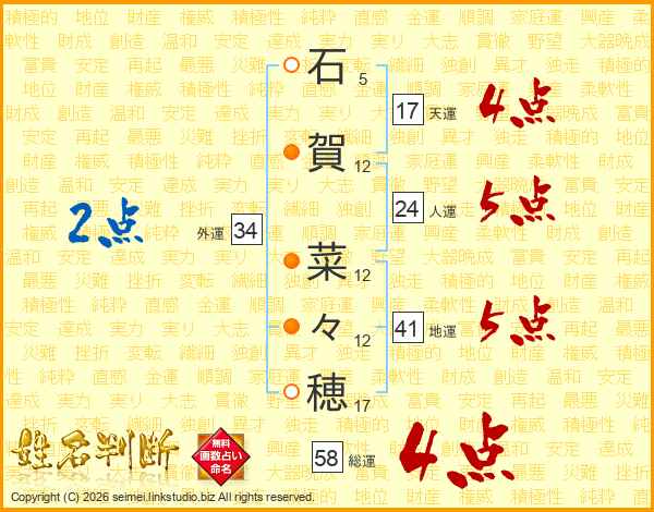 石(5画)賀(12画) 菜(12画)々(12画)穂(17画)
