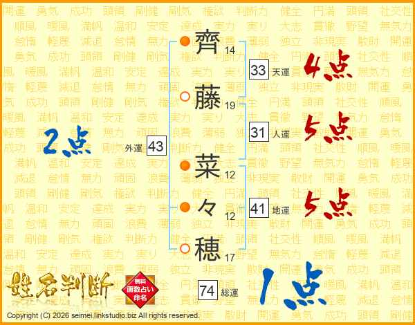 齊(14画)藤(19画) 菜(12画)々(12画)穂(17画)