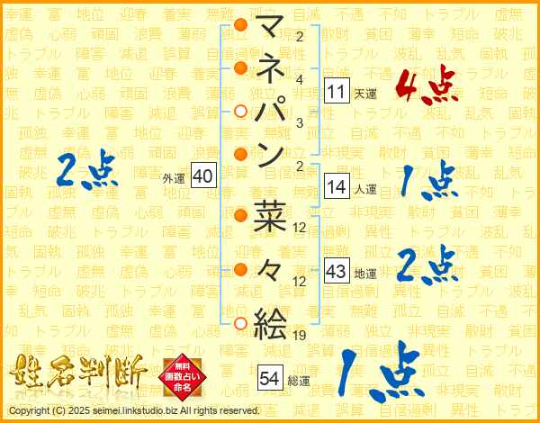 生活面を象徴する運勢です。外部から受ける影響力を表し、結婚運、家庭運や職場、環境への順応性を表します。総運から人運を引いた画数。姓や名が1文字の場合を除く。