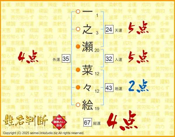 一(1画)之(3画)瀬(20画) 菜(12画)々(12画)絵(19画)
