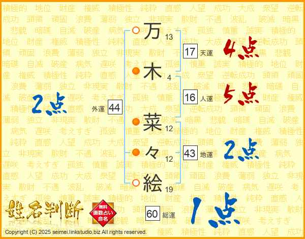 万(13画)木(4画) 菜(12画)々(12画)絵(19画)