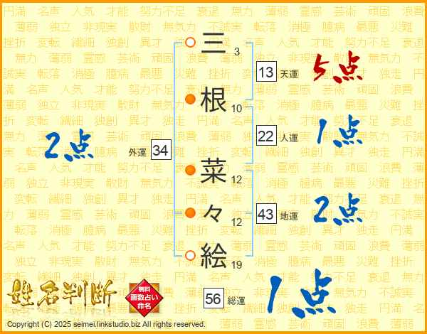 三(3画)根(10画) 菜(12画)々(12画)絵(19画)