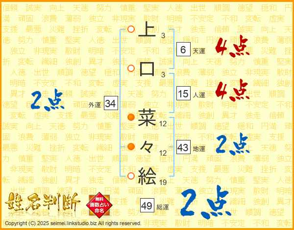 画数の奇数(○陽)と偶数(●陰)の配列で吉凶を占います。どちらかにかたよる名前は大凶名で避ける必要があります。画数の奇数偶数。