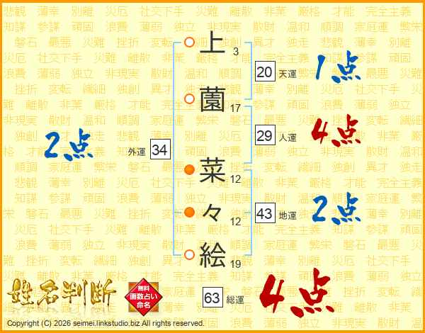上(3画)薗(17画) 菜(12画)々(12画)絵(19画)