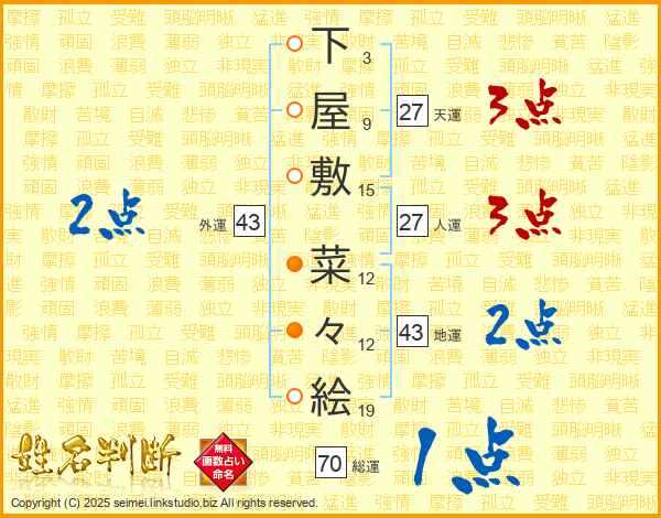 下(3画)屋(9画)敷(15画) 菜(12画)々(12画)絵(19画)
