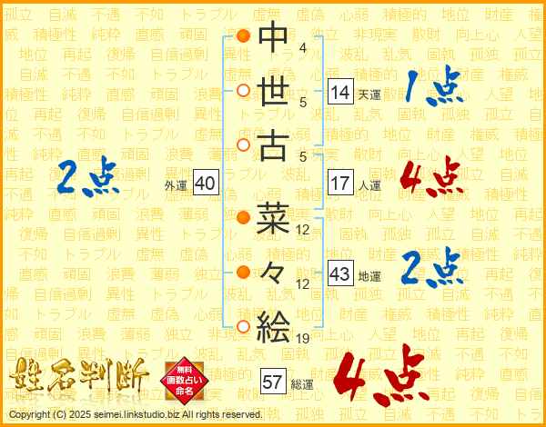 生活面を象徴する運勢です。外部から受ける影響力を表し、結婚運、家庭運や職場、環境への順応性を表します。総運から人運を引いた画数。姓や名が1文字の場合を除く。