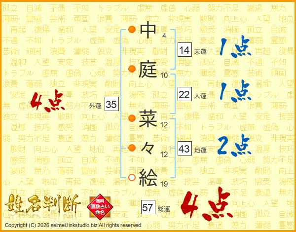 中(4画)庭(10画) 菜(12画)々(12画)絵(19画)