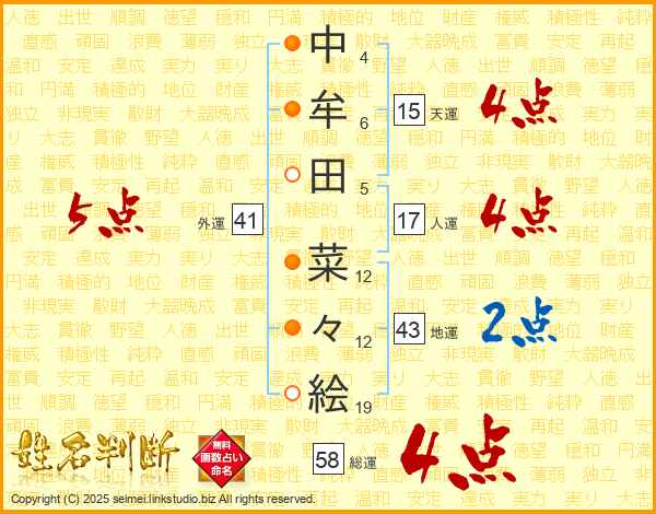 中(4画)牟(6画)田(5画) 菜(12画)々(12画)絵(19画)