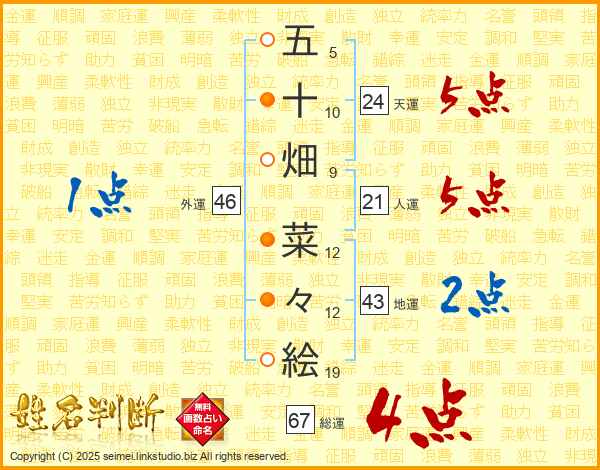 生活面を象徴する運勢です。外部から受ける影響力を表し、結婚運、家庭運や職場、環境への順応性を表します。総運から人運を引いた画数。姓や名が1文字の場合を除く。