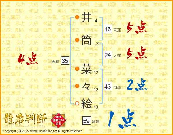 井(4画)筒(12画) 菜(12画)々(12画)絵(19画)