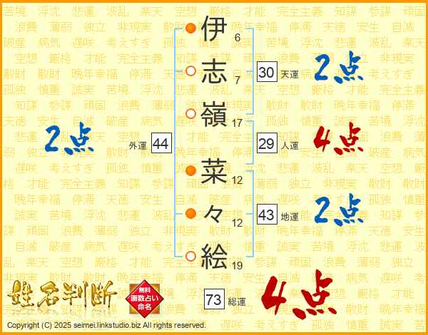 伊(6画)志(7画)嶺(17画) 菜(12画)々(12画)絵(19画)