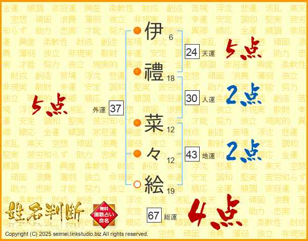 伊(6画)禮(18画) 菜(12画)々(12画)絵(19画)