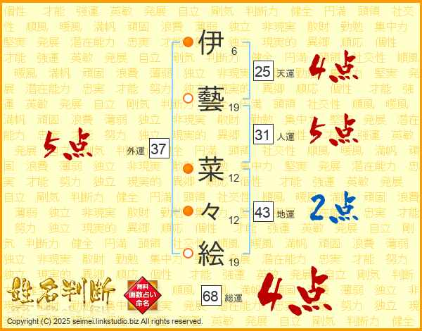 伊(6画)藝(19画) 菜(12画)々(12画)絵(19画)