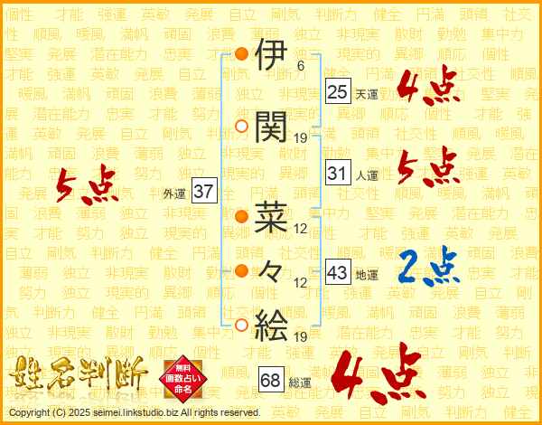 伊(6画)関(19画) 菜(12画)々(12画)絵(19画)