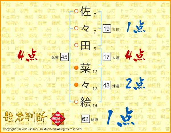 佐(7画)々(7画)田(5画) 菜(12画)々(12画)絵(19画)
