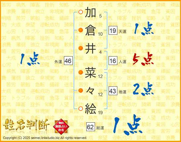 加(5画)倉(10画)井(4画) 菜(12画)々(12画)絵(19画)