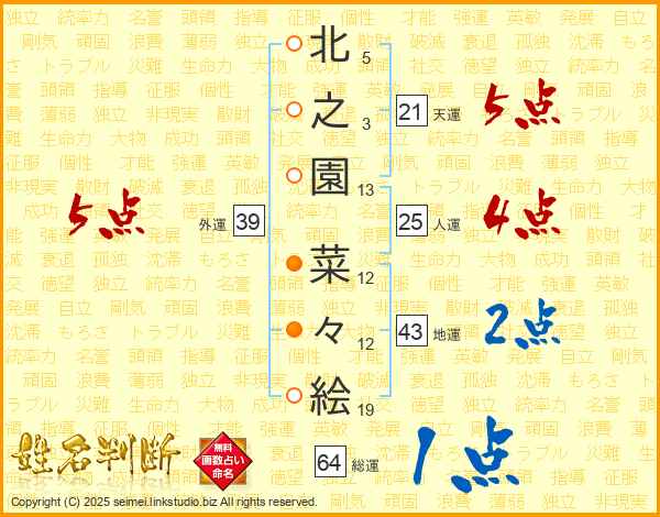 北(5画)之(3画)園(13画) 菜(12画)々(12画)絵(19画)