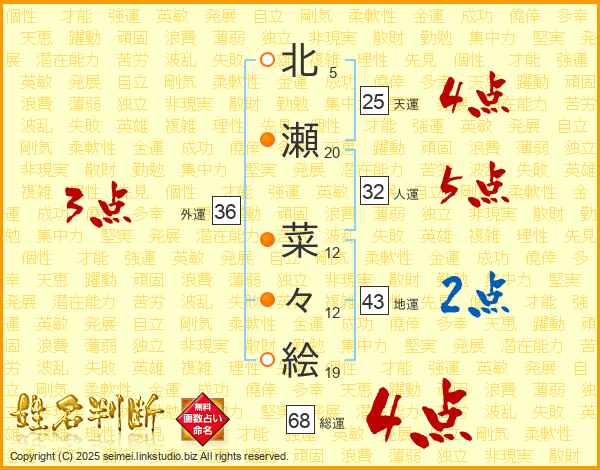 北(5画)瀬(20画) 菜(12画)々(12画)絵(19画)