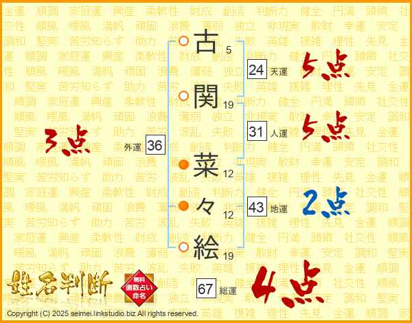 古(5画)関(19画) 菜(12画)々(12画)絵(19画)
