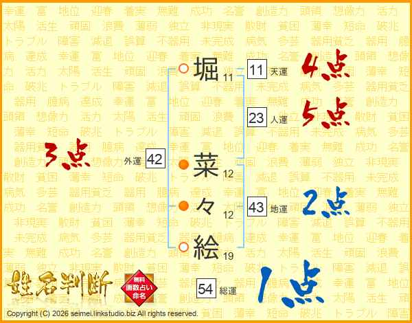 堀(11画) 菜(12画)々(12画)絵(19画)
