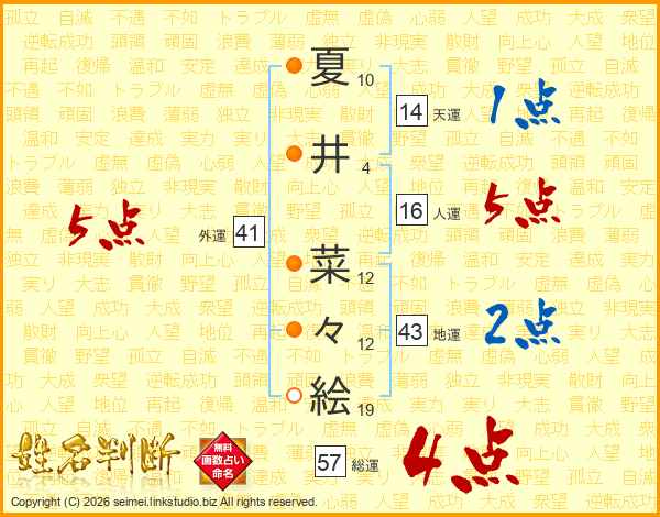 夏(10画)井(4画) 菜(12画)々(12画)絵(19画)