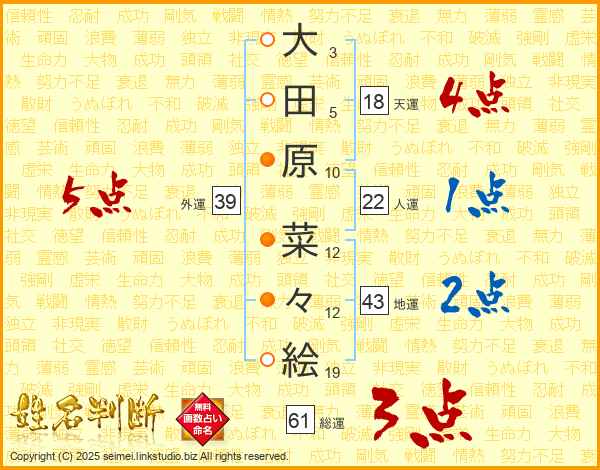 大(3画)田(5画)原(10画) 菜(12画)々(12画)絵(19画)