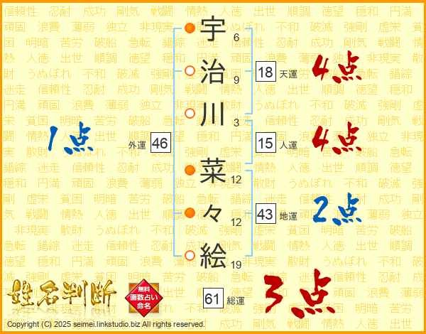 宇(6画)治(9画)川(3画) 菜(12画)々(12画)絵(19画)
