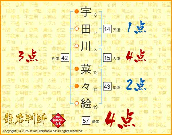 宇(6画)田(5画)川(3画) 菜(12画)々(12画)絵(19画)