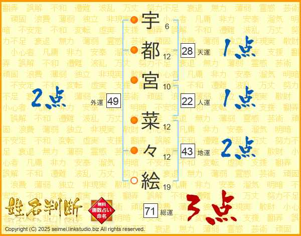 宇(6画)都(12画)宮(10画) 菜(12画)々(12画)絵(19画)