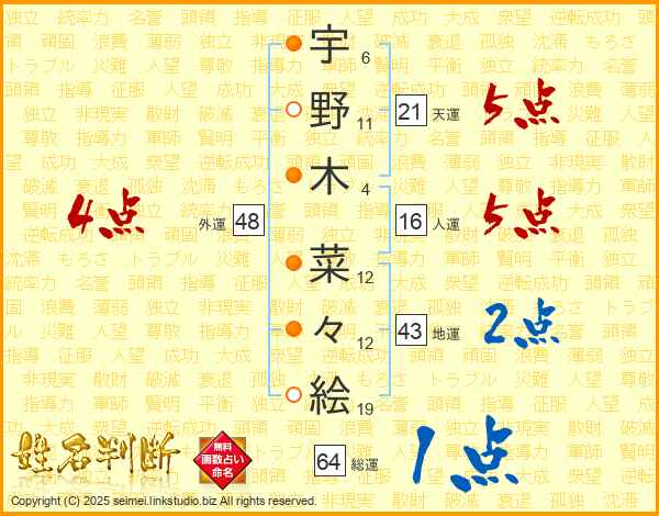 宇(6画)野(11画)木(4画) 菜(12画)々(12画)絵(19画)