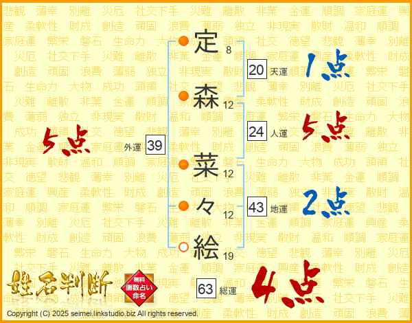 定(8画)森(12画) 菜(12画)々(12画)絵(19画)